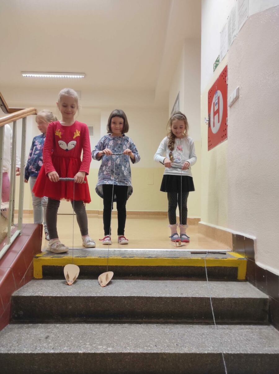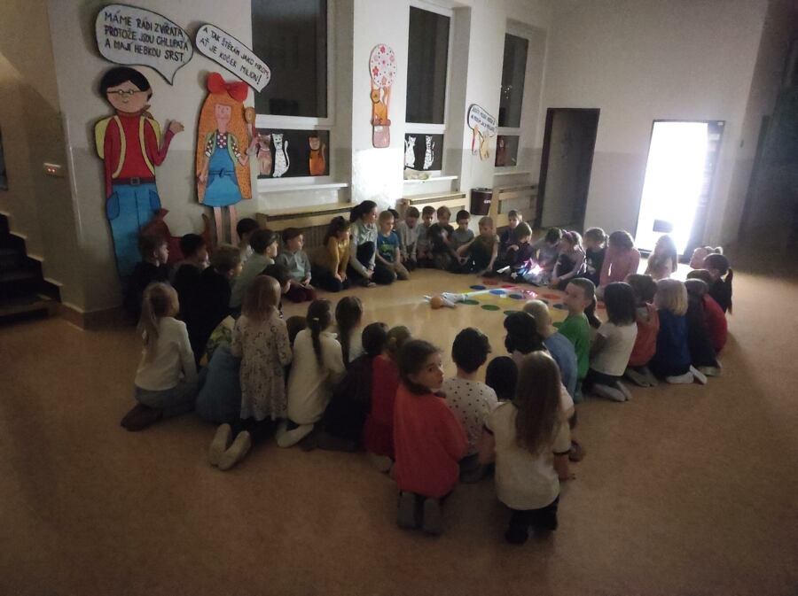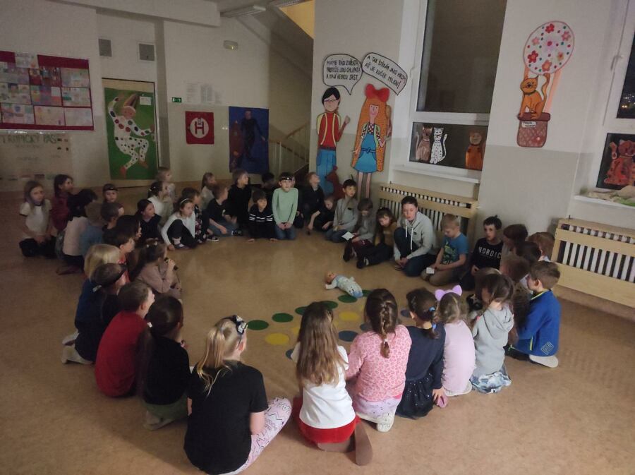 Prvňáčci si vyzkoušeli, jaké to je přespat ve škole. Během večera zažili bohatý program zaměřený na pohádky O pejskovi a kočičce. A jak to má při správné pohádkové noci být, vyslechli si spoustu pohádek. Zachraňovali chudou noční košilku, „pekli“ s pejskem a kočičkou dort, chytali myši. Nechyběla ani procházka večerní školou, při které sbírali hračky pro panenku, která tence plakala. Další den po snídani vyrazili do divadla Gong, aby viděli, jak ztvárnili pejska a kočičku herci na jevišti.