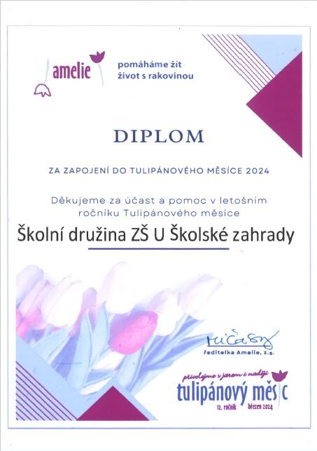 I v letošním roce školní družina podpořila prostřednictvím organizace Amelie osoby s onkologickým nemocněním.