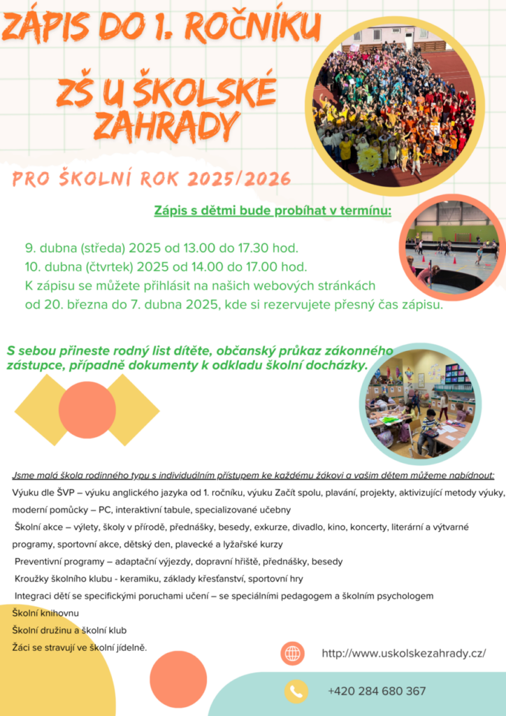 Informace a formuláře k zápisu: https://www.uskolskezahrady.cz/informace-k-zapisu/